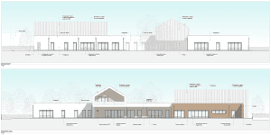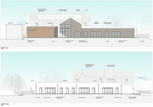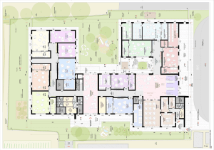 Il progetto, con le sue 9 sezioni, si sviluppa quasi interamente al piano terra, fatto salvo che per la porzione centrale, che si evolve al piano primo con un’ala completamente dedicata al personale, dove troverà collocazione un’ampia sala insegnati, un ufficio, bagni, spogliatoi per il personale ATA e locali di servizio (magazzino, ripostiglio, locale tecnico).